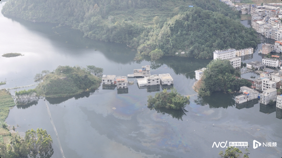 这些航拍视频,从俯瞰的视角记录了洪水肆虐后的景象:田地里的作物和连接外界的道路几乎完全被淹没,难以辨认。被洪水围困的村庄,要么群山环绕,要么地处低洼,只有高大繁茂的树木从水面探出一丛丛树冠。被泡的房屋聚集而建,远远望去宛如一座座孤岛。