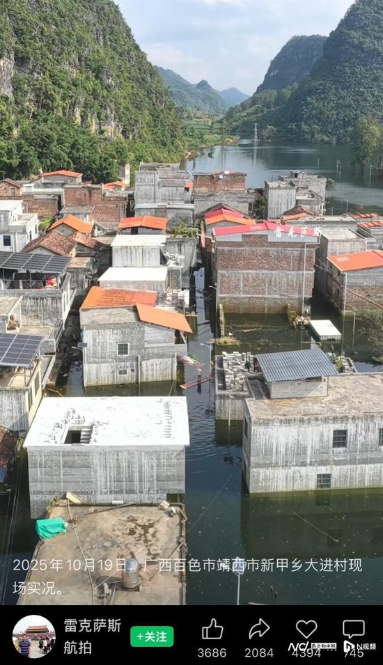10月19日,靖西大进屯水位实况。网络航拍博主视频截图