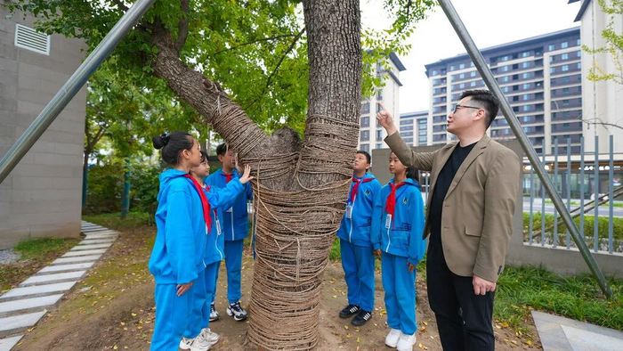 “观察长势、浇水施肥、修枝剪叶,我们悉心投入到乡愁树的养护工作中。”交接仪式上,首届守护古树志愿队队员刘妮可回忆道,有一次,乡愁树的叶子长了蚜虫,她和队员们急得围着树转,小心翼翼地把被蚜虫伤害的叶子摘下来。那段时间,他们每个课间都跑到枣趣园观察和照顾乡愁树,直到蚜虫慢慢减少,树叶重新变得油亮,才松了一口气。