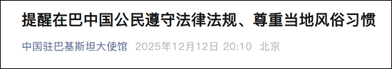 微信公众号“中国驻巴基斯坦大使馆”12月12日消息,近日,个别在巴中国公民因未经允许对当地女性拍摄视频等原因,与当地民众产生争执并造成治安事件。