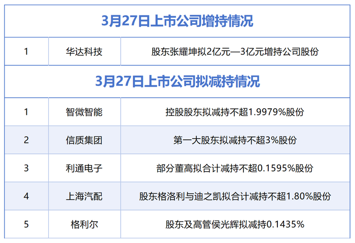 据统计,3月27日,盘后华达科技披露增持情况,智微智能、信质集团、利通电子、上海汽配、格利尔5家A股上市公司披露拟减持情况。
